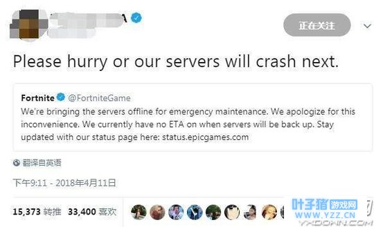 《堡垒之夜》官方推特写道:“因紧急维护,服务器将下线,对此造成的不便敬请谅解。目前暂时不知道何时恢复……”而那个“蹭热度”的不可描述网站转推回复道:“请你们快点吧!要不我们的服务器该崩了!”