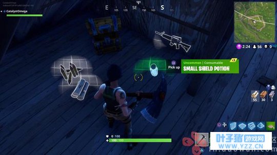 在堡垒之夜中,健康被分为两种类型:你的人物生命,是屏幕下方绿色的条,你的护盾,是蓝色的条——每一个在100点。护盾会在生命之前首先消耗,当你的生命耗尽你就死了。但是比赛开始时你没有护盾,所以你必须找到一个。 宝箱是你经常能找到药品的地方,尤其是蓝色的护盾药剂。这些在你有限的背包中占据空间,既然比赛开始时你没有护盾,所以当你发现它们的时候,最好是尽快喝下,因为你的盾牌会一直持续到它损坏为止。护盾药剂有两种。大药可以给你50护盾,并且可以叠加两次,使你的健康加倍;小药给你25护盾。不过,只有大药才能把你推到100,如果你用两个小药,你最多拥有50护盾。 注意护盾不会保护你免受伤害,所以要照顾好你自己。如果你能找到像绷带和药包这样的药品,你可能会想要带着以便以后使用(绷带给你15生命,最多75个,而医疗包会完全治愈你)。一种更罕见的药品,叫做“果汁”,它是在紫色的瓶子里,让你每秒1点补充你的护盾并且恢复健康,持续25秒,使它在一个棘手的情况下变得更加灵活。更稀有的水壶是非常有用的东西,完全恢复你的健康和护盾,但需要15秒使用。 观察玩家的建筑
