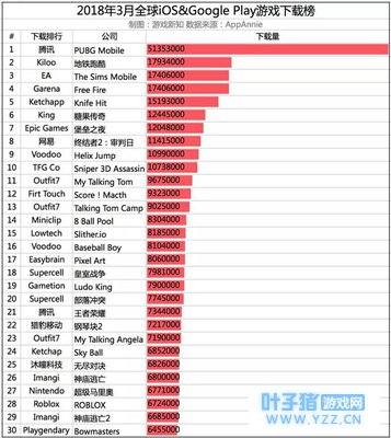 今天AppAnnie更新了20018年3月全球游戏应用指数(榜单所有数据均不含中国安卓平台)。 全球iOS&Googe Play下载榜: 榜单基本上可以看到腾讯的吃鸡手游已经压制了网易吃鸡,不过Epic Games新发布的《堡垒之夜》也来势汹汹。 腾讯的《绝地求生》以超5000万的下载榜排在了榜单第1名,下载量差不多是第2名《地铁跑酷》的3倍;SEA的吃鸡游戏《Free Fire》以1740万的下载量排在第4位;Epic Games《堡垒之夜》下载量1200万,排在第7位;网易的《终结者2:审判日》下载量仅有1140万,只能排在第8位。 《王者荣耀》至今也还有700多万的下载量,大概可以排在榜单第21位。