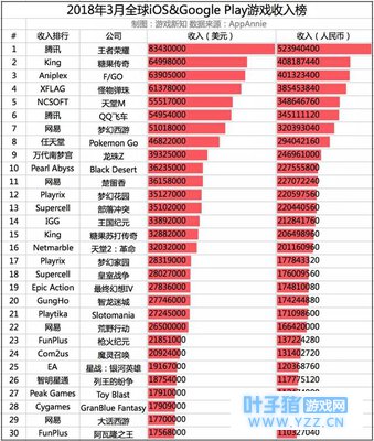 3月全球iOS&Googe Play下载榜TOP30 (注:省略了千位数后面的尾数) 全球iOS&Google Play收入榜: 拿下全球双榜收入冠军的依然是腾讯旗下的《王者荣耀》,3月份《王者荣耀》以5亿元人民币(再次强调,不含中国安卓平台)的收入重新回到了第1名的位置;King旗下的消除游戏《糖果传奇》拿下4亿元排在第2名;网易的《梦幻西游》和《楚留香》分别拿下了3.2亿和2.2亿,《大话西游》在1.1亿左右。 主攻海外市场的《王国纪元》《火枪纪元》《列王的纷争》《阿瓦隆之王》,收入都超过了1亿元。 网易的《荒野行动》也很值得注意,收入大概在1.66亿元,能够排到收入榜第22名。