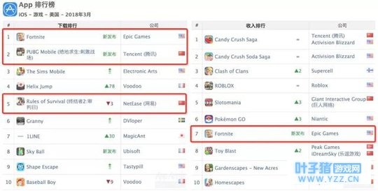 美国iOS榜: 美国下载榜上表现最好的吃鸡游戏分别是《堡垒之夜》《PUBG Mobile》和《终结者2:审判日》。在收入榜上只有《堡垒之夜》上榜。