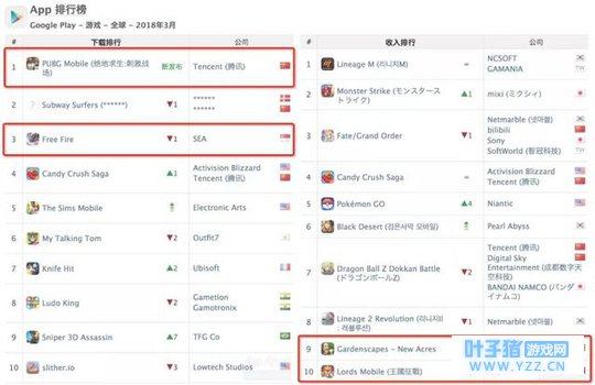 全球Google Play榜: 《PUBG Mobile》在Google Play下载榜也是排在第1名,其次SEA的《Free Fire》排在了第3名。而在收入榜上,IGG的《王国纪元》是唯一入榜的中国手游。