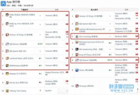 中国iOS榜: 腾讯游戏几乎垄断了下载榜,拿走了前面7个席位,其余3席位分别属于乐元素《开心消消乐》、网易的《荒野行动》和Outfit7的《汤姆猫》。 在收入榜上,网易开年大作《楚留香》保住了第4名的位置,腾讯新发布的《QQ炫舞》爬到了第8名。整个榜单已经找不到第3家厂商的位置了。