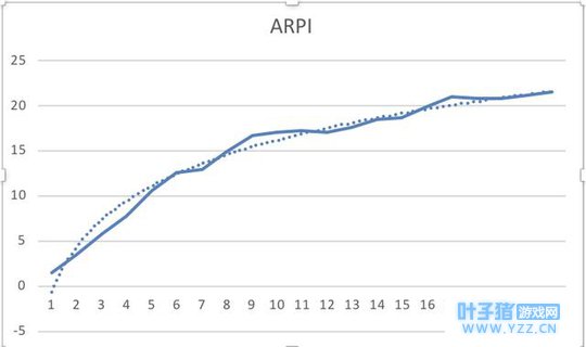 在18~44岁男性中,愿意玩一款像《堡垒之夜》这样相对硬核的PvP游戏的玩家占比不会超过20%(我认为这个比例已经相当高了)。1.11亿部iPhone手机x 20% =大约2220万部iPhone手机。 换句话说,《堡垒之夜》iOS版本的潜在玩家人数大约为2220万。 根据媒体报道,截止到今年4月7日,《堡垒之夜》iOS版本的下载量介于1100万~1400万次之间——在《堡垒之夜》所有潜在玩家中,已经下载游戏的玩家占比已经超过50%。 很显然,我在分析时做了大量假设,援引的数据也略显初浅,但我觉得误差不会太大。这也就意味着至少在iOS平台,考虑到《堡垒之夜》当前的下载量增速,这款游戏的玩家人群很快就会达到饱和。 2. 付费设计 就个人而言,在《堡垒之夜》手游发布之前,我在西方市场从未见过任何一款移动游戏作品的主要收入来源于装饰性内购道具。在我看来,如果一款手游只将销售装饰性道具作为付费点,那么其平均每用户终身价值(LTV)超过0.20美元就相当高了。 装饰性道具当然也能创造可观收入。笔者了解(注:作者在世嘉担任网络首席产品官)《梦幻之星在线2》的营收方式,我知道在亚洲,游戏内装饰性道具是一个可行的盈利点;在日本,《勇者斗恶龙》等手游也通过卖装饰性道具赚取了大量收入。 不过在西方市场,这让人很难相信。但也不是毫无可能。 在《堡垒之夜》手游中,“战斗通行证”(BattlePass)也是个有趣的付费点——通过与任务系统和升级机制的结合,“战斗通行证”不只是装饰性道具,还能够提升玩家的游玩体验(例如提升获取经验值的速度)。 Epic通过每季推出新的“战斗通行证”(大约每两个月一次),让它成为了《堡垒之夜》的持续收入来源之一。 根据Sensor Tower提供的数据显示,截止到4月6日,《堡垒之夜》iOS版本净收入1050万美元,全球下载量1100万次,折算下来平均每次安装收入(ARPI)大约为0.95美元。 通常来讲,移动游戏的ARPI值会随着时间推移增长;对F2P游戏来说,ARPI的增长速度可能很快。下图显示了一款RPG手游的ARPI值增长趋势,该作的LTV最终很可能会达到至少22~23美元之间。