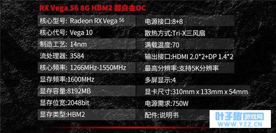 蓝宝石Vega56超白金OC的核心频率高达1550MHz,动力十足,HBM2的显存位宽2048bit,配合几何引擎、像素引擎和新一代计算元等新技术,让显卡的性能指数得到很好的提升,保证畅玩2K《堡垒之夜》无压力,同时对其他主流游戏也有很好的支持。