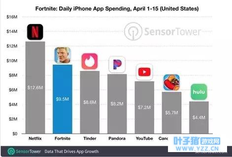 而在移动端上,虽然PUBG授权的腾讯开发的《PUBG Mobile》(国内的《绝地求生 刺激战场》)和《堡垒之夜》移动版都获得了大量用户的下载,但是由于《PUBG Mobile》尚未开启付费,因此在营收上,其已经远远被《堡垒之夜》抛在了身后。 根据Sensor Tower公布的数据,在上线的第一个月内,仅在iOS单个平台上,《堡垒之夜》就在全球范围内就获得了2500万美元(1.5亿人民币)的营收。此外,在四月的前半个月中,《堡垒之夜》在美国iOS的收入仅次于娱乐流媒体服务Netflix,排在了iOS游戏收入榜的第一位。
