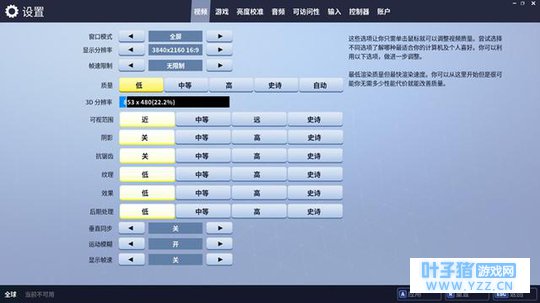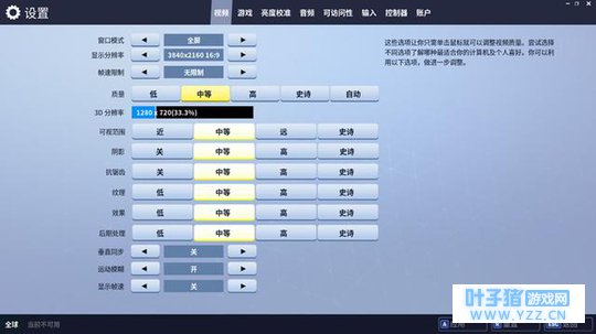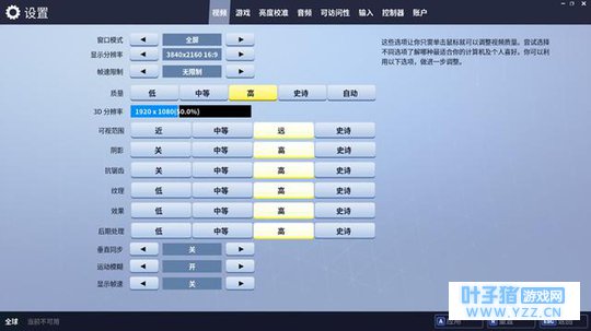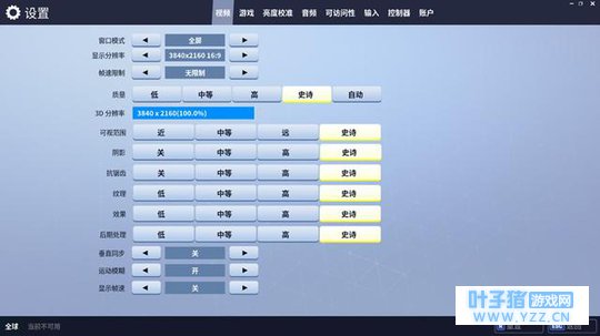 史诗画质默认设定 《堡垒之夜》一共提供有4种预设画质,分别是低、中等、高以及史诗画质,涉及到3D分辨率、可视范围、阴影、抗锯齿、纹理、特效、后处理等项目,每一个预设画质都有自己固定的配置,当然玩家也可以根据自己的需求去进行自定义。