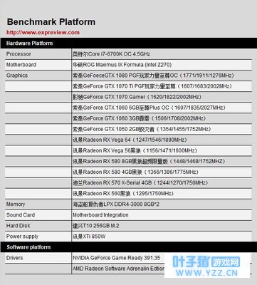 测试平台采用的是超频至4.5GHz的Intel Core i7-6700K处理器,配置总容量为16GB(8GB*2)的双通道海盗船复仇者系列DDR4-3000内存,使用华硕Maximus IX Formula(Intel Z270)主板,以建兴T10 256GB M.2 SSD作为硬盘。 显卡方面,这次我们选用了GeForce GTX 1080/GTX 1070 Ti/GTX 1070/GTX 1060 6GB/GTX 1060 3GB/GTX 1050 2GB/GTX 1050以及Radeon RX Vega 64/RX Vega 56/RX 580 8GB/RX 580 4GB/RX 570 4GB/RX 560 4GB共计12款主流 和高端显卡,具体型号如上表所示,用于评估《堡垒之夜》对显卡的需求。