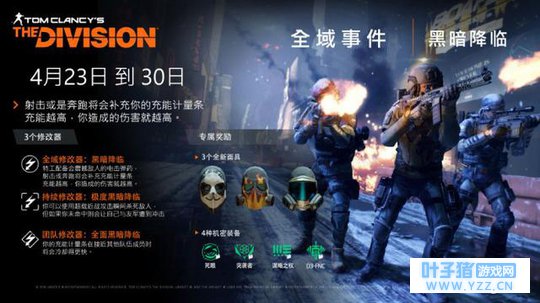 育碧中国公布《全境封锁》全域事件“黑暗降临”活动会在4月23日到30日进行,新活动包含3个修改器,专属奖励,感兴趣的玩家可以了解一下。