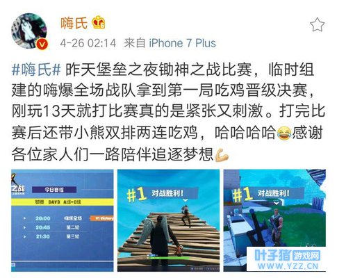 并且嗨氏的堡垒之夜玩的非常6,嗨氏发微博: 昨天堡垒之夜锄神之战比赛,临时组建的嗨爆全场战队拿到第一局吃鸡晋级决赛,刚玩13天就打比赛真的是紧张又刺激。打完比赛后还带小熊双排两连吃鸡。