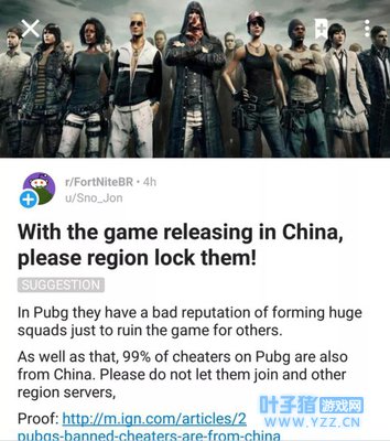 总结起来就是三大原因: 1)中国玩家爱组队,容易很多人一起违规组队(类似之前的红衣军),如果到时候碰到二三十人一对的汇总国玩家,会让游戏体验极差 2)中国玩家爱作弊,说白了就是他们觉得很多中国玩家喜欢使用外挂,而且占比很高,有据数据统计,因为开挂被封禁的绝地求生玩家99%来自于中国 3)中国玩家人太多,国外玩家在玩绝地求生美服时,每局都会碰到一半以上的中国人,如果堡垒之夜也这样,他们会受不了 另外,国外网友还反复强调这并不是地域歧视,而是害怕“中国玩家再毁掉这个游戏”(在他们眼里H1Z1已经被毁了,绝地求生已有这个趋势)