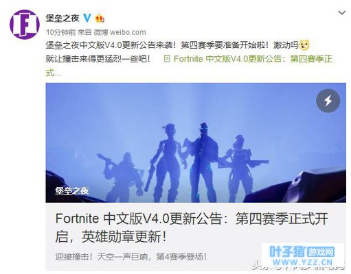 然而,5月3日《堡垒之夜》官博发布了关于新版本更新和第四赛季即将来临的消息,这个消息咋一看之下好像并没有什么特别的。但是,从官博的字眼中可以看出,似乎国服的第四赛季新版本也在紧锣密鼓的准备中。