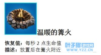 温暖的篝火 篝火是一个小道具,能够恢复生命值,是一个在多排时很有用的装备,篝火不可以直接放在地上,需要先建一个横板,在一定范围内(差不多就一个横板的大小,超出这个横板就没办法回血了)的队友和自己在每秒内共同回复2滴生命值,持续25秒,很多时候没有包就只能打绷带,但绷带又只能恢复到75,这时候篝火就显得很关键了,建一个掩体,然后放上篝火,和队友一起回回血,聊聊天,再接着玩。