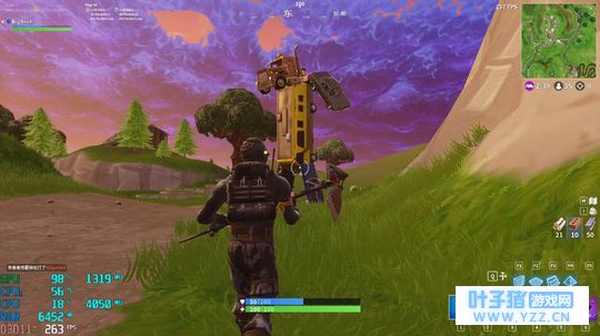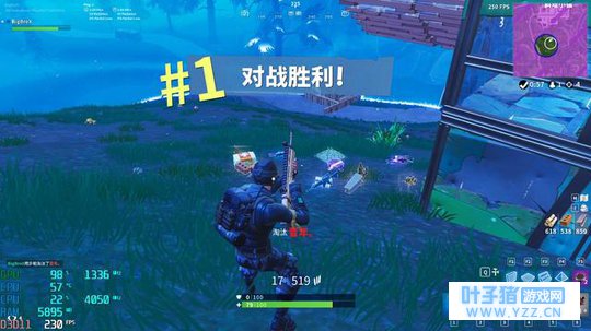 从这里一系列截图来看,显卡并没有那么容易达到100%满载,更多是在98%左右(其实跟满载没有多大区别~~)。画面可以保证在200FPS以上,虽说60FPS的画面已经可以保证完好的游戏体验了,但是FPS越高,掉帧情况越少,画面越稳定,游戏体验当然也会更好了,拿个第一还不是轻轻松松。 CPU方面相比史诗画质反而占用高了,但是温度还是保持在57°C左右,不用担心CPU温度过高。 看到这里相信大家对史诗画质和最低画质都有了解了,自己的电脑配置大概能开多高特效,能到多少FPS,心里都有点X数了。 其实这个游戏除了杀敌和建房,还有别的游戏方式。 玩法之三:跳伞模拟器。