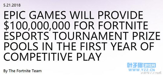北京时间2018年5月22日,堡垒之夜官方宣布将会在2018至2019年首个电竞赛季提供总额高达1亿美元总奖金池!