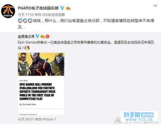 就连Fnatic俱乐部的官博都开玩笑道:我们也有堡垒之夜分部,官博现在转型来不来得及..