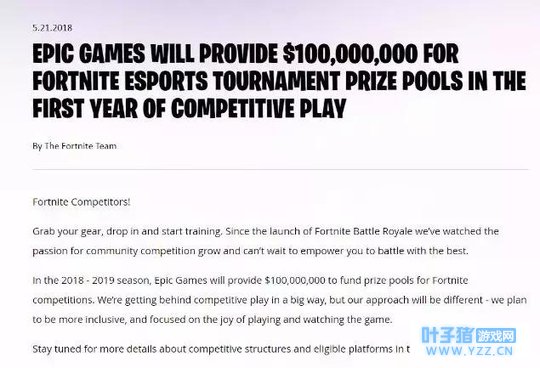 2017年排名前十游戏的电竞总奖金额为9120万美元 Epic Games已经证实,这1亿美元的奖金将全部用于第一年的赛事奖励。这也意味着,在未来的12个月内,《堡垒之夜》赛事活动将会出现一波巨额奖金池。 举办电竞赛事,进一步扩大领先优势去年年底,《堡垒之夜》在“吃鸡”战场表现出色,并保持了这一强劲势头。尽管这款游戏受到全球众多玩家的追捧,但《堡垒之夜》至今还没有开启电竞赛事。 此次公告也意味着,Epic Games将会在不久的将来采取大动作,并将为这款游戏的电竞赛事提供长期支持。不难看出,Epic Games希望通过电竞进一步扩大其在“吃鸡”领域的领先优势。