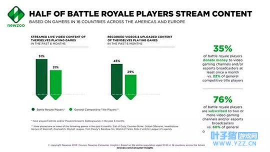 超过一半的“大逃杀”玩家直播游戏内容“大逃杀”玩家的高参与度还体现在观看游戏直播方面。根据Newzoo数据统计,超过80%的“大逃杀”玩家会选择观看游戏直播和电竞赛事。 在观看电竞时长方面,28%的“大逃杀”玩家每月观看数次电竞赛事,而竞技类玩家的这一比例为19%。 报告显示,在过去的六个月中,有81%的“大逃杀”玩家观看了游戏直播,而直播游戏内容的“大逃杀”玩家占到了51%。相比之下,只有67%的竞技类玩家观看了游戏直播,而直播游戏内容的竞技类玩家仅为31%。 根据Newzoo的数据,在过去的六个月中,在上传录制视频方面,45%的“大逃杀”玩家上传了预先录制的玩游戏的视频,而竞技类玩家的这一比例为29%。 《堡垒之夜》更休闲 VS 《绝地求生》更硬核而在“大逃杀”游戏中,目前最火爆的两款“吃鸡”游戏当属《堡垒之夜》和《绝地求生》。有意思的是,根据数据显示,有40%的玩家同时玩这两款吃鸡游戏。而仅玩《堡垒之夜》的玩家占到了35%,高于仅玩《绝地求生》的玩家(25%)。
