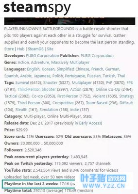 中国玩家在《绝地求生》占比几乎过半,而在国内这款游戏的热度下滑也最为明显,除了手游抢夺了更多的用户时间外,《绝地求生》严重的外挂问题也是众多玩家弃坑的主要原因。Steamspy数据显示,近两周玩家在《绝地求生》上的平均时间仅17分钟左右,相比几个月前缩水了一半。