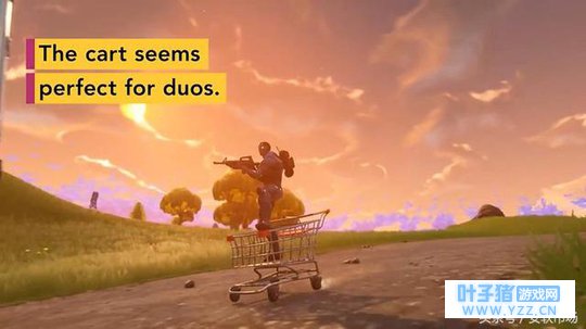 在最新的4.3版本更新中,购物车载具正式上线。没错,你没有看错,购物车!购物车!购物车!重要的事情说三遍。你以为真实跟你开玩笑呢,玩游戏堡垒之夜可是认真的。那么要怎么这款载具呢?相信大家小时候在超市的时候肯定也玩过,就是一只脚搭在购物车上,另一只脚不停的蹭地就行了。游戏中也是一样吗,就这么简单粗暴。当然在购物车上也是可以进行正常的射击的。