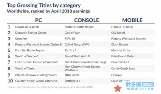 作为主机游戏,《堡垒之夜》的增长似乎势不可挡,再次打破了数字主机游戏收入的单月记录,得益于《堡垒之夜》和《战神》的推动,四月份数字主机游戏收入同比增长了44%。 4月全球PC平台游戏收入榜前十名分别是:《英雄联盟》、《DNF》、《CF》、《梦幻西游2》、《堡垒之夜》、《魔兽世界》、《炉石传说》、《坦克世界》、《绝地求生》和《CSGO》。 《战神》不仅实现了非常高的收入数据,还成为了有史以来最畅销的PS4独占游戏;《堡垒之夜》的大逃杀模式在主机、PC和手游平台四月份收入为2.96亿美元(折合人民币约19亿元),超过了3月份创下的2.23亿美元记录,Epic 此前曾宣布,截至今年3月,《堡垒之夜》最高同时在线达340万、用户量超过4000万,3月中旬推出的手游版还一举拿下北美appstore畅销榜第1的成绩,成为全球范围内的现象级产品。前不久,Epic更是宣布《堡垒之夜》将推出1亿美元的电竞赛事奖金池,超过了目前十大电竞游戏之和。 另一方面,《GTA V》最终在发布多年之后开始走入衰退期,《GTA V Online》在四月份的收入同比出现9%的下滑,结束了连续12个月的同比增长。实际上,进入2018年之后,该游戏的收入就一直在下滑,这很可能有一部分原因是来自于《堡垒之夜》的竞争,另一个原因,可能与Rockstar缺乏重大内容更新有关,随着玩家对于游戏内容的消耗速度增加,所有平台的游戏都被迫进入快速更新的状态,过去传统游戏平台发布之后就开始下一个项目的做法,已经变得越来越不可行。 主机平台(数字游戏)4月收入榜Top 10:《堡垒之夜》、《战神》、《FIFA 18》、《使命召唤:二战》、《孤岛危机5》、《GTA V》、《彩虹六号:围攻》、《幽灵行动:荒野》、《NBA 2K18》和《战地1》。 《战神》是迄今为止最成功的独占主机游戏,自4月份发布之后,该游戏的首月销量预计超过了500万套,几乎是第二大PS4专属游戏《神秘海域4》的两倍多。