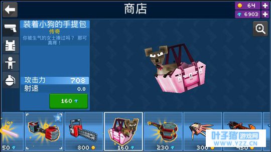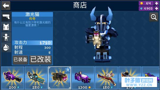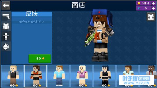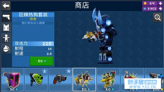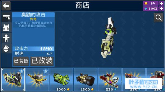 它与同类型产品最大的区别点在哪?随心所欲的“做自己”。 什么是做自己? 我个人理解的“做自己”是借助某些元素向外界表现自己的特征(性格、气质)、学术能力、阅历积累什么的。比如在《我的世界》里,基于同样一个地形,不同玩家会造出的差异化显著的建筑,浅一点则体现了玩家对艺术的认知度以及对于该艺术下的文化内涵理解与向往,而深一点来看,正是玩家向外界传达“这就是我”这一无形信号。所以在这样一款游戏里体现“做自己”就是创作不同的艺术作品,这最好的表现就是有人造了长城、有人通过想象力去搭建谜一般的亚特兰蒂斯甚至弄个400米高的一柱冲天什么的奇迹。 那么在《像素大战》手游里用户是如何做自己的?创意兵器与个性皮肤是最核心的支撑元素! 我们先来聊一下玩家在游戏里的整体进程: “创建角色——体验多种不同模式的战斗——资源获取皮肤与武器——继续战斗” 这就是玩家在游戏里要做的事情,通过这个流程也可以看得出游戏还是很注重快节奏,并没有设置过多又臭又长的前置准备甚至是像上班一样的日常任务。虽然如此精短的环节看起来似乎有些单调,但事实上本作也处处充满了创意与用心,并给予了玩家“做自己”的机会! 首先是武器。 不得不说,《像素大战》手游开发商Mad Pixel LTD确实脑洞惊人,在滑稽范围内几乎能把所有可伤人的物品都设计成了武器;