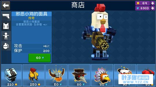 而不管是射击距离突出的枪支还是脑洞清奇的冷兵器,至少《像素大战》手游降低了进入门槛,满足的是大众用户,这样一来,即便你不是射击游戏的爱好者,但你依然可以凭借对这种创意的好奇加入其中。 除了武器,皮肤也是影响玩家“做自己”最重要的元素。 《像素大战》手游的皮肤极具创意,但最大的亮点是“够怪”,按照惯例依旧上图。 看到下面这个鸡头没?有没有觉得它的俩眼珠有些似呆似邪?