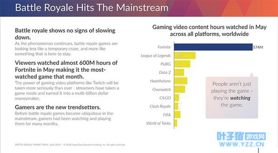 《堡垒之夜》“吃鸡”模式通过内购已经获得了超过10亿美金的收入,这对于《堡垒之夜》来说无疑是个重要的成就,这款游戏也对整个主机市场产生了冲击。5月份,《堡垒之夜》在Twitch的总收看时长达到5.74亿小时,吃鸡类游戏总收看时长接近7亿小时,让“吃鸡”类游戏成为Twitch站点最受关注的类型。