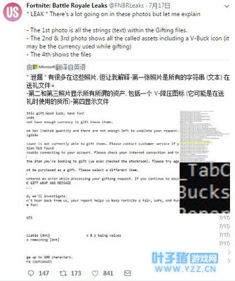 数据挖掘者已经在游戏文件中找到信息,表明玩家很快就可以在游戏内物品甚至可能是V币中互赠礼物。著名的数据挖掘账户'FNBRLeaks'已经发布了涉及赠送系统的各种编码和文本字符串的几个屏幕截图。