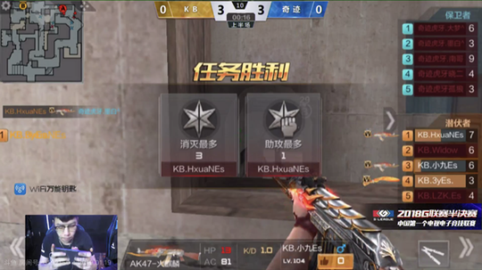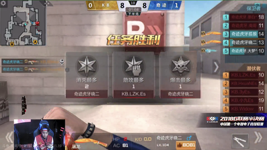 加时赛依旧是爆破战,来到卫星基地。奇迹担任潜伏,KB担任保卫。酱油一人在A区连着清掉了两名潜伏,墨白在B区一波骚扰过后,遭遇了酱油的断后,KB先拿一分。可以看出双方都在求稳且不漏点位,很快奇迹还了南哥单局四杀,双方互不相让都想要拿到这一大比分。主要压力还是在KB这边,KB不能再失去这一大分。双方你一分我一分,追得很紧。中路第一时间一波道具,带走双方不少血量,大梦在小道一波突击,连续带走三人,拿下关键一分后奇迹势不可挡,最终还是2:0战胜了KB。