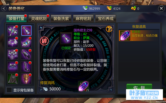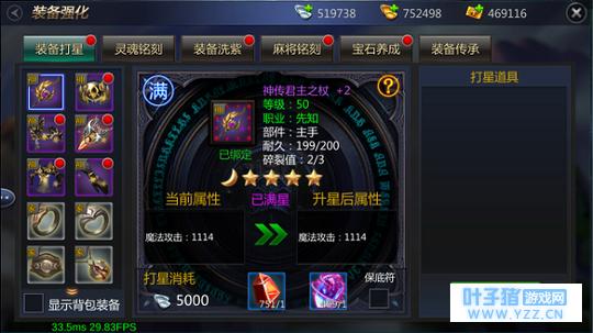 不同档次的装备对应不同的打星水晶,高级的打星水晶可以通过合成变成高级的水晶, 目前世传套装满星为5星,国传套装为7星,神传套装为10星,装备打星达到7星就可以激活装备的发光外观效果,超过7星后打星失败会消耗装备的碎裂值,可以添加麒麟玉髓防止碎裂,碎裂值用光后装备就无法使用了,必须通过道具恢复碎裂值。