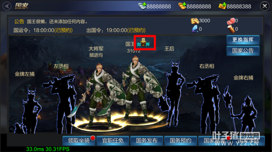 当国家产生国王后,国王自动获取语音指挥权,国王在活动时间内进行指挥。 注意:若国王无暇顾及,也可将指挥权限转移给本国其他官员。若有官员认为自己可当大任,也可以通过国家界面申请指挥权限。非国家官员的玩家可在角色头像下方将频道切换至指挥频道,即可收听指挥。 所以,重点是: 1.国王无条件获取指挥权; 2.国王可主动将指挥权任命给官员; 3.官员可向国王申请获取指挥权,但需国王同意。 4.指挥一旦开始,不需要按住按钮才可发音,双手可专注于PK。 下面来看真实画面: