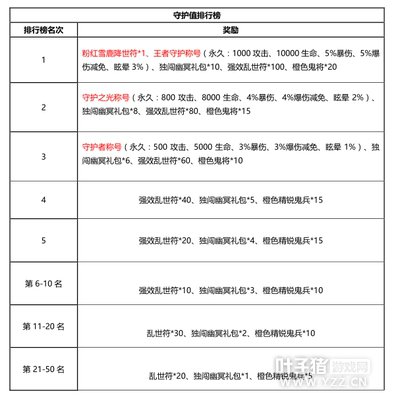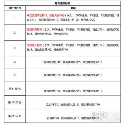 活动时间:8月24日8点-8月31日6点 活动范围:全服 活动规则: 1、 活动期间内加入两个新的排行榜,魅力值排行榜与守护值排行榜 2、 魅力值:当角色收到钟情一生、爱无止境、钟情一生花篮、爱无止境花篮时,则自身的魅力值将会相应的提高 3、 守护值:当角色献出钟情一生、爱无止境、钟情一生花篮、爱无止境花篮时,除好友度外自身的守护值将会相应的提高 4、 钟情一生提供1点(魅力值、守护值)、爱无止境提供9点(魅力值、守护值)、钟情一生花篮提供99点(魅力值、守护值)、爱无止境花篮提供999点(魅力值、守护值) 排行榜奖励:当活动结束时(8月31日18:00),根据两个排行榜的名次依次给予以下奖励,奖励5个工作日发放完毕。 注:积分相同的玩家按上榜时间先后进行排名 活动奖励: