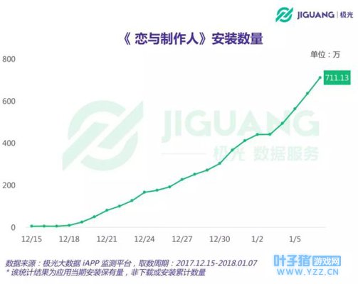 从目前的游戏体验来看,《QQ飞车手游》做到的可远不止是靠IP,更重要的是与时俱进做的种种改变。 为了实现在手机上核心手感的保留,没有简单的照搬端游,而是对“移动竞速”做更精深的研究;为体现社交元素,在游戏中给男女性玩家提供了全方位的社交互动;完善各类排行榜机制,满足玩家的“攀比、炫耀”目的。 从游戏核心的提炼,到外围系统的细节追求,《QQ飞车》现有的成绩就是最好的体现! 3、 《恋与制作人》 主打女性市场的《恋与制作人》在2018年年初爆发了。 截至2018年1月7日,《恋与制作人》的安装量达到711.13万,DAU超过200万。女性用户占比达到94.2%,其中20-24岁的用户超过一半达57.9%。