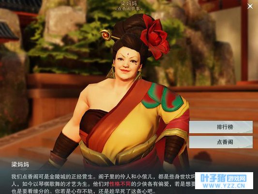 嘿嘿嘿,就是类似古时候的“青楼”但是别想多,点香阁只能寻欢! 先给大家看一下点香阁的大BOSS!梁妈妈~~