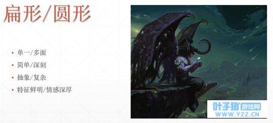 刚才讲 群像塑造当中,大部分是扁形人物,扁形人物就是极致强化一个角色最重要的点,不考虑其他的点,甚至把他抽象化成一个符号。 比如我们能够想象到的喜剧角色,大部分到最后都会成为一个代名词。扁形人物一般用于配角,而圆形人物用于主角。 所谓 圆形人物,就是对一个角色多维度、多层面的性格塑造 。这个角色往往会得到大家强烈的认同和共鸣。 像伊利丹和阿尔萨斯都是这种角色,不是单纯的黑或白。他的行为里面有更加深层次的原因,有自己的人格和逻辑体系,更加复杂。我们会着力刻画他的性格、背景如何造就了今天的他。他的情感非常饱满,能够牵动玩家的心。所以扁形角色应该特征非常鲜明,让大家有一个印象或者抽象成一个词;而圆形人物往往是非常真实、饱满,使得玩家在他身上寄予了非常深厚的情感。 3.4 塑造方法 前面讲角色设计就是“他是一个什么样性格的人,经历了哪些事”。但是怎么告诉玩家,就要把设计传达出来。角色的传达可能会有很多,比如名字、外形、特殊能力、语言风格、过去经历、癖好…… 一个有癖好的人是容易被人记住的。 最最重要的一点是当他面临外界巨大压力的时候,会如何抉择。 有时候为了塑造不同的角色,我们会让不同的角色面对同一件事情,展开成各自不同的选择和表现,这也是强化主题层次的方式。 只有角色在面临重大压力之下,才能凸显出最重要的品质,这就是所谓的高光时刻,玩家会因为这个品质最终喜欢上角色。 现在还有一个很有意思的现象,就是颜值时代到来了。 很多角色,大家因为模型漂亮而特别喜欢。如果模型特别 好看、角色又塑造特别好,角色的魅力会更丰富。 所以角色的行为与选择,对角色性格的塑造非常重要。林平之、岳不群和令狐冲,在面对《辟邪剑谱》的时候,他们的选择完全不动,这跟他们的经历有关。