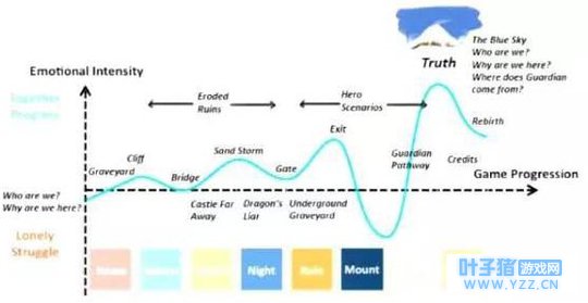 这是陈星汉在他的讲座里提到过的关于《Journey》的情绪曲线设计,与好莱坞的剧本设计有相似之处,又经过了更适合游戏的改造。开场的时候要有一个高潮,抓住你的注意力,在最大的高潮之前,甚至要制造一个低谷来凸显这个高潮。 推荐大家去玩一下陈星汉的游戏,对这个曲线会有更深刻的理解。 4.3 表现力