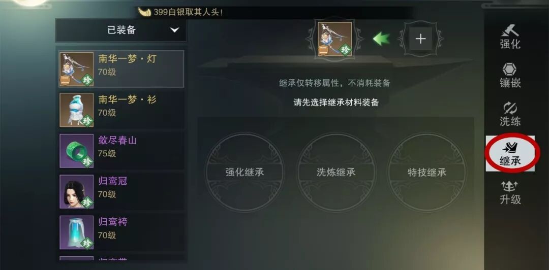 每逢少侠换上更好的新装备,都会有系统提示是否继承和转移原装备内容,若是想主动操作,只需在 【装备-继承】 里操作就好啦。