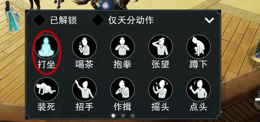 大家都是有内功的江湖中人,脱战状态下在表情栏里选“打坐”,这时候你就会 气沉丹田,进入物我两忘的状态,然后 血量和内力就会慢慢回复啦 。