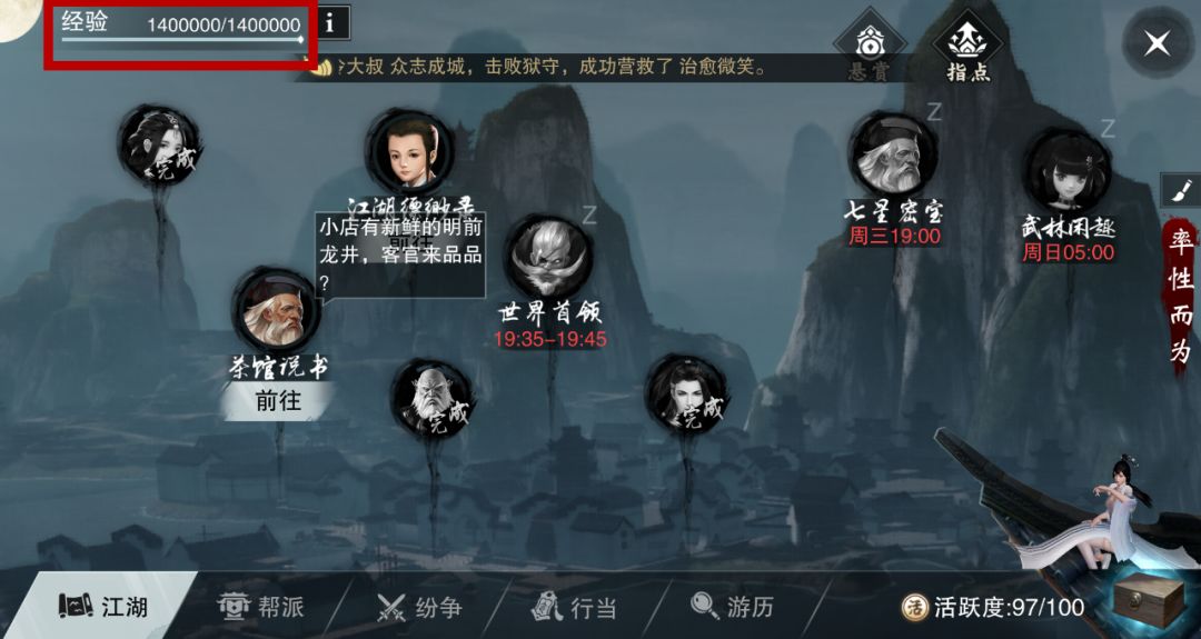 并且,游戏中设置了 活动经验上限 ,每日活动可获取经验是有限的!打开活动面板,左上角就有 进度条 。至于完成哪些玩法,选择权在你的手里哦。 (PS:活动经验与剧情经验互不影响。)