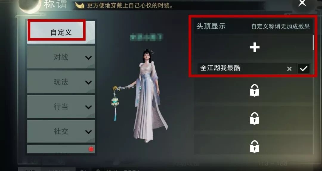 江湖称谓如何设定,三哥这就告诉你。点击个人页 面 【称谓】 按钮,则可进入自定义称谓页面,在此写下你想要的江湖称号。