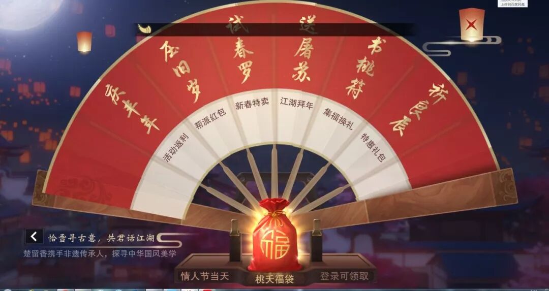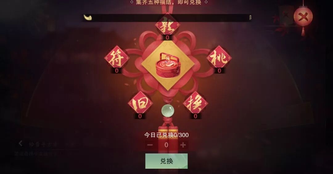 参与每日一卦、茶馆说书、帮派任务玩法 会随机获得写有"新"、"桃"、"换"、"旧"、"符"的福结 集齐5种福结可以兑换五福礼盒,每日上限300次