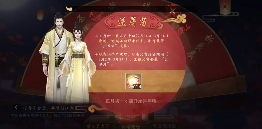 我李小四行走江湖受到了不少前辈的照顾 这次过年,一定要好好拜访 而且拜年可是有回礼的! 不仅可以拿大量经验~还有机会获得广寒灯! 广寒灯可以用来兑换元宵主题套装“云烘月(永久)"