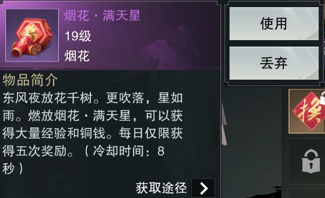 只要在春节活动期间登录游戏 参与帮派任务、茶馆说书、平乐宴活动 或采集世界宝箱 就可以获得烟花·满天星~