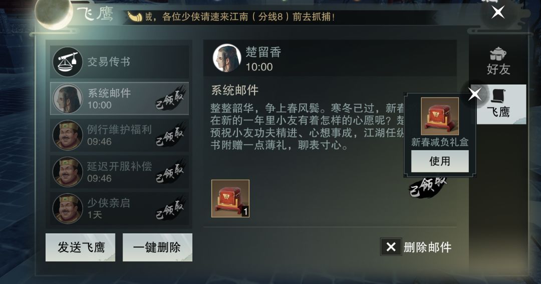 在春节活动期间,每一位到达19级的少侠 每日登录都将获得天机阁放送的 【减负礼】 内含: 20个悬赏令和1个烟花·满天星