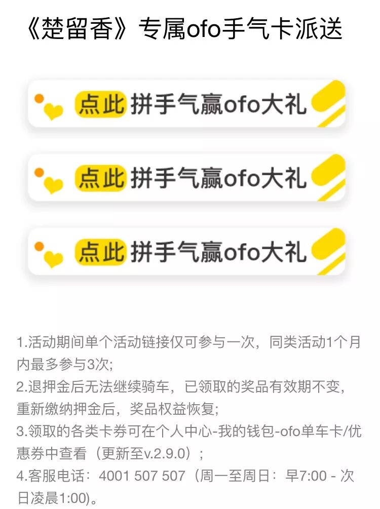 点击本文 即可申领 《楚留香》专属ofo小黄车骑行手气卡~