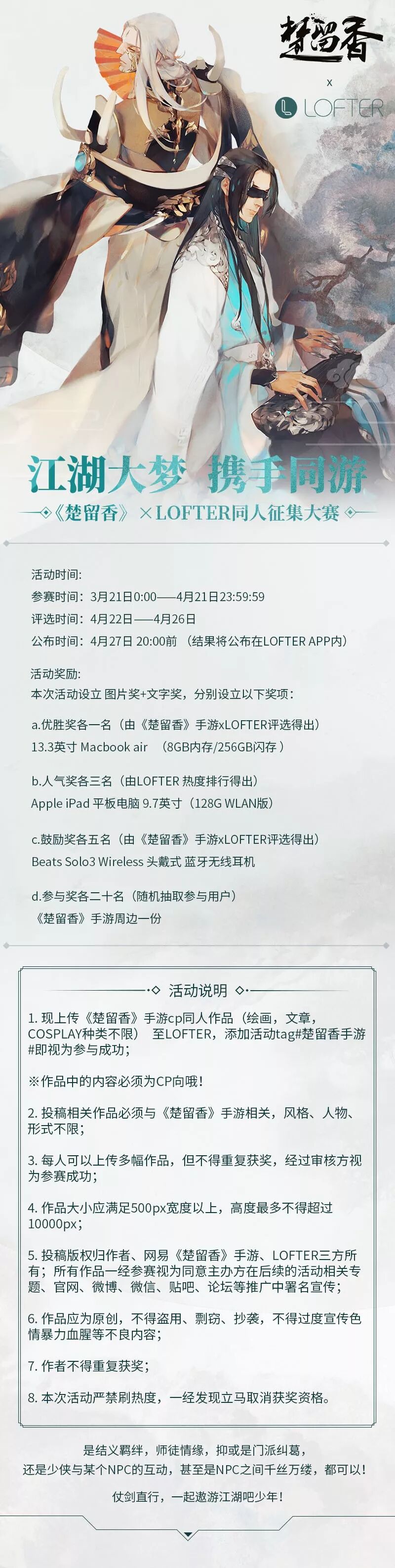 江湖大梦,仗剑而行 总有一段经历令人难以忘怀 总会遇到一些人 是江湖路上最不能错过的风景 或许是路人,或许是知己 他们之间会有怎样的故事呢? 花样CP,百无禁忌! 楚留香XLOFTER同人征集大赛开始啦!