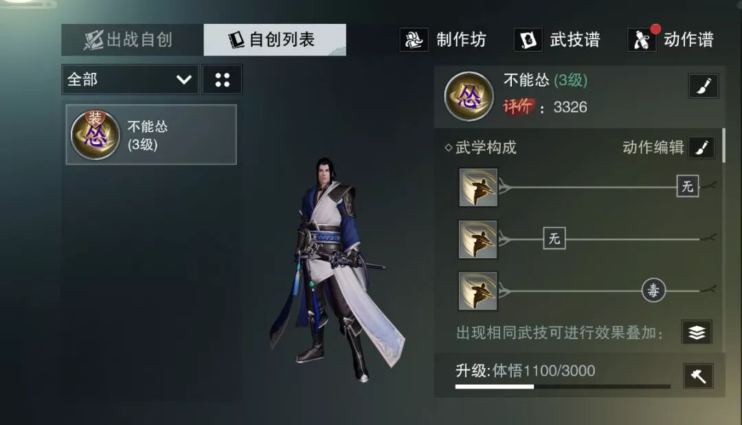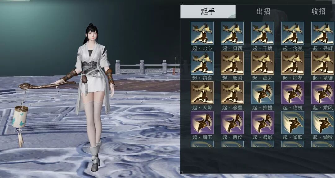 通过上图,你们也知道了 自创武学分为起手、出招、收招三个部分 每一部分都有极其丰富的 动作谱 可以互相搭配组成不同的动作招式!