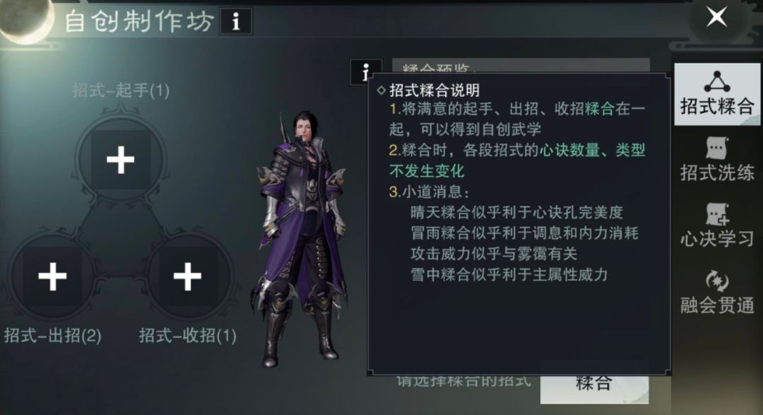当然了,别以为你糅合了个武学就以为大功告成了。在糅合完你蓝色6孔招式后(起手2孔、出招2孔、收招2孔),得到的自创武学还只是1个胚子。
