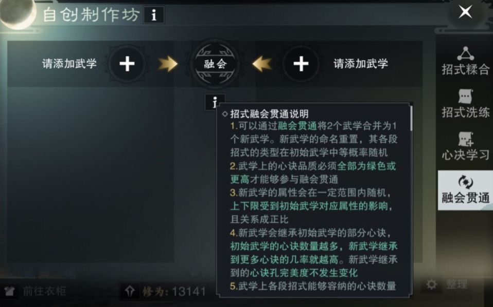 ➤ 1、所谓的“融会贯通”,即是指 两个武学合成一个新武学 。武学招式类型的起、出、收是随机选取到新武学上的。